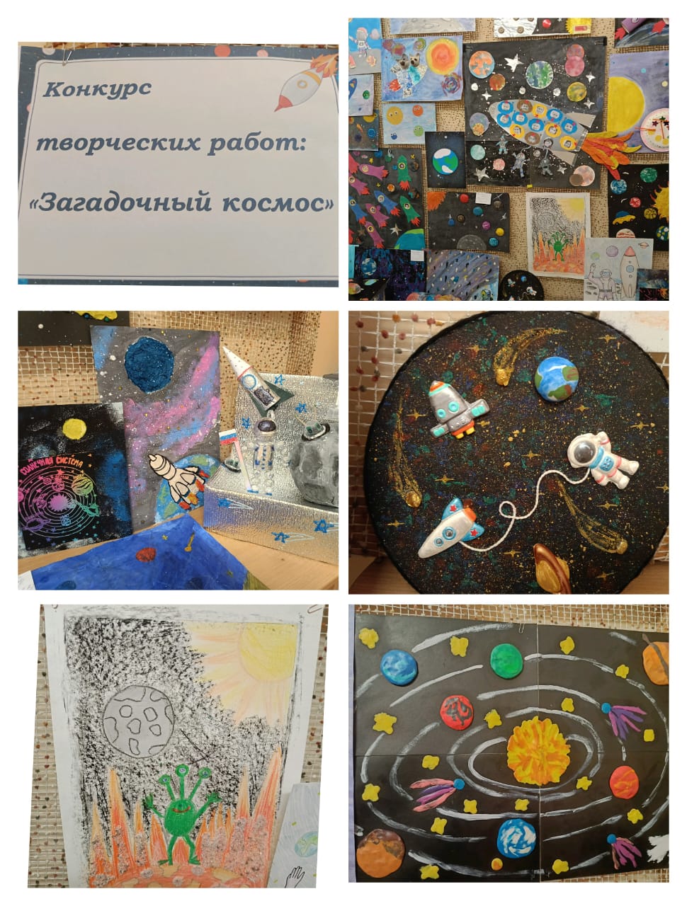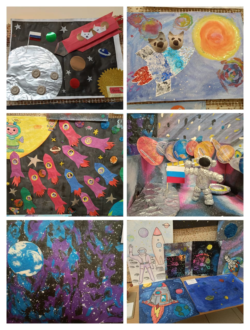 Совместные работы детей и родителей, а также сотрудников - творческие, интересные, познавательные. Поделки выполнены в разной технике и из различных материалов: картон, цветная бумага, фольга, пластилин, одноразовая посуда и т. д. Ракеты, космические корабли, космонавты, забавные инопланетяне и летающие тарелки - каждая работа уникальна! Каждая поделка, которую мастерил ребенок вместе с папой и мамой, это предмет гордости перед друзьями в детском саду!