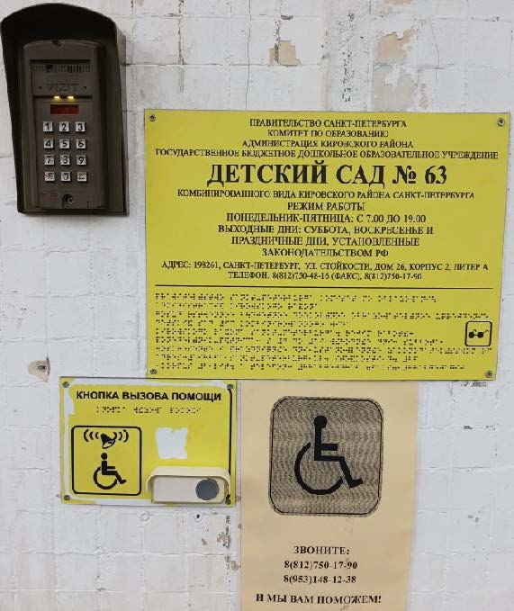 - При входе в здание расположена кнопка вызова и табличка, исполненная шрифтом Брайля для инвалидов по зрению для вызова сотрудника учреждения для оказания помощи инвалидам (сопровождение до места оказания услуг).